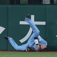 さらに、この試合を象徴したのは5回の守備。五十幡亮汰選手の放った中堅後方への大飛球に全力で追いすがり、フェンス際でダイナミックにキャッチ。しかし、その勢いで左肩をフェンスに強打し、しばらく立ち上がれないアクシデントに見舞われました。
