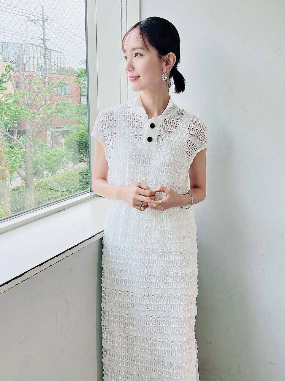 髪をひとつに束ね、白いニットワンピースにアクセサリーをプラスした洗練されたスタイルの最新ショットを公開したのは、元「YURIMARI」で活躍した女優の中村ゆり。デコルテラインの透け感が目をひくトップスを美しく着こなしている。