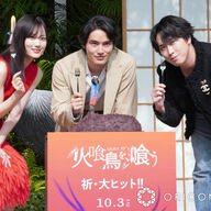水上恒司主演『火喰鳥を、喰う』キャスト、“火喰鳥おはぎを、食う” 宮舘涼太が長尺で“思念”送る 俳優の水上恒司、山下美月、宮舘涼太(Snow Man)が23日、都内で行われた映画『火喰鳥を、喰う』(10月3日公開)の大ヒット祈願イベントに出席… (出典:オリコン) |