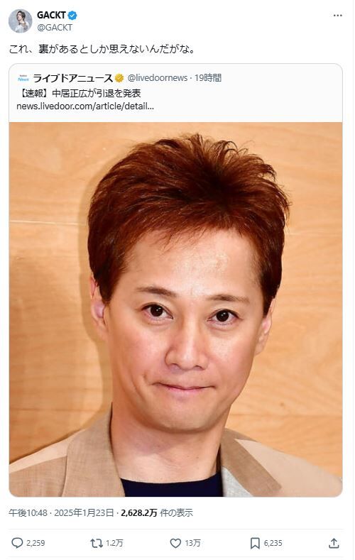 GACKT 中居の引退に「これ、裏があるとしか思えないんだがな。」