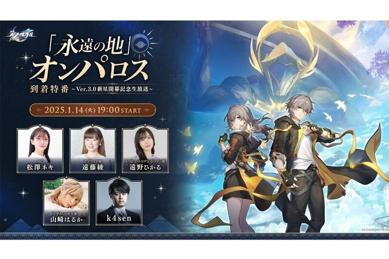 COGNOSPHEREは1月9日、グローバルエンターテインメントブランドHoYoverseが運営するスペースファンタジーRPG『崩壊:スターレイル』[iOS/Android/PC(HoYoPlay/Epic Games Store)/PlayStation 5]において、『「永遠の地」 オンパロス到着特番~Ver.3.0新星開幕記念生放送~』を配信予定だと発表。配信日時は、2025年1月14日19時より。