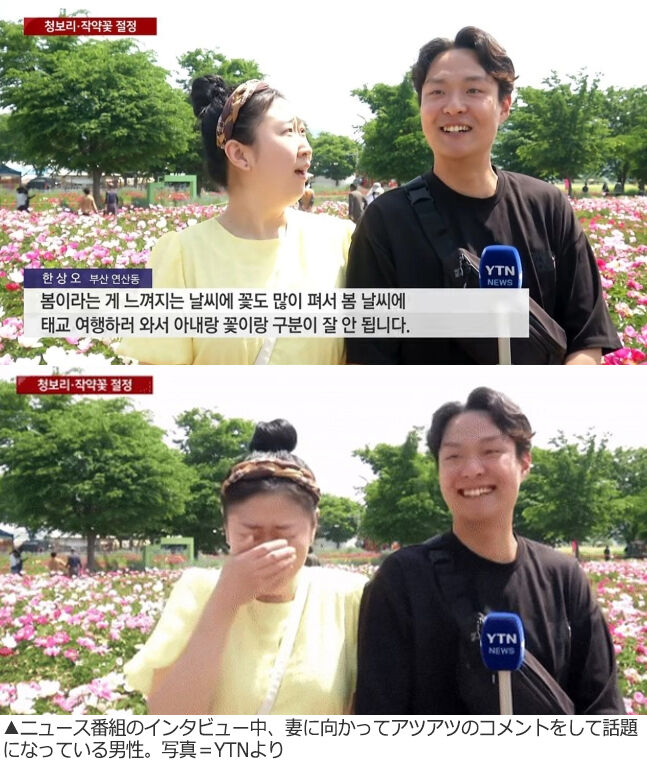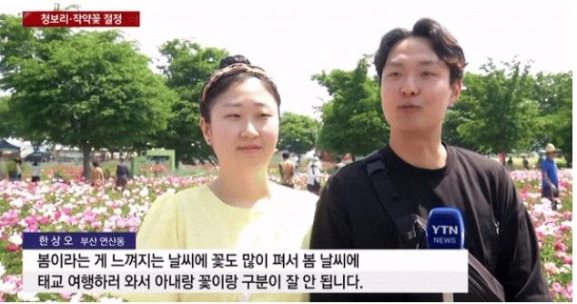 韓国YTNニュースは、青々とした麦とシャクヤクの花が美しい慶尚南道咸安郡に来た観光客の姿を11日に報道した。この日、妊娠中の妻と一緒にいたハン・サンオさんがインタビューに応じ、「春の陽気に誘われて胎教旅行に来ましたが、妻と花の見分けがつきません」と語った。