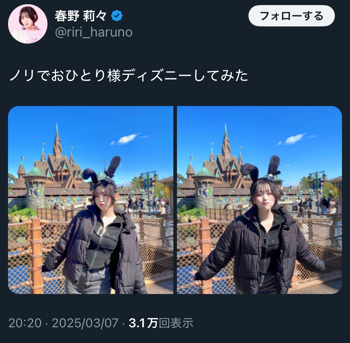 【画像】アイドルの高嶺のなでしこ:春野莉々さん、おひとりディズニーしてネットがひっくり返る