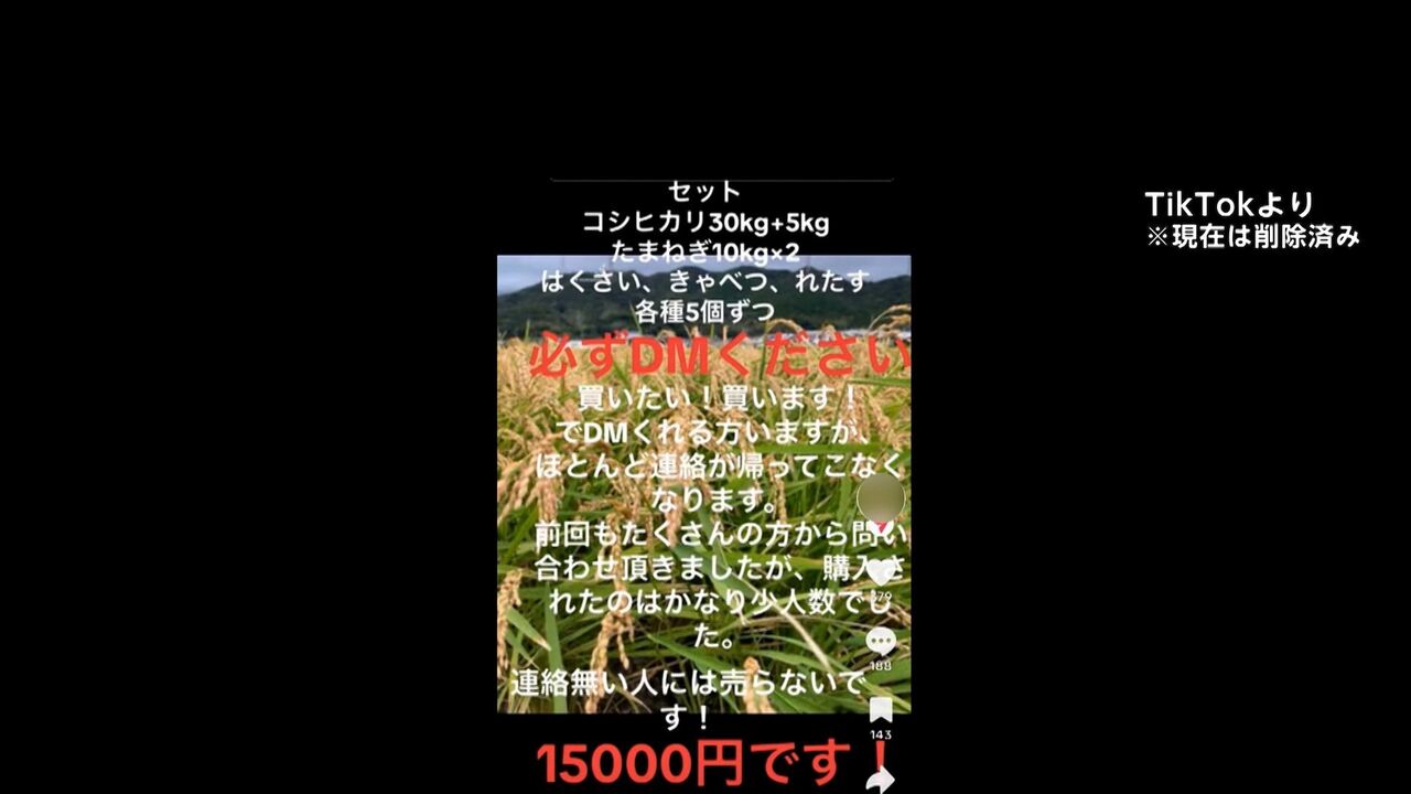 被害者の女性によると、きっかけは、2月の上旬、“個人の米農家”を名乗るアカウントがTikTokに投稿した「コシヒカリ30キロ+5キロ。1万5000円です」と書かれてある画像だ。