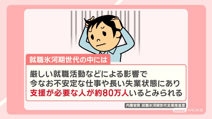 就職氷河期世代の中には、厳しい就職活動などによる影響で、今なお不安定な仕事や長い失業状態にあり、支援が必要な人が約80万人いるとみられています。