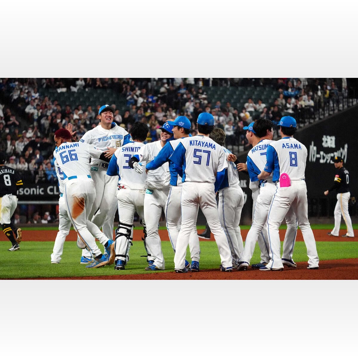@hanana3306092025/05/21 エスコン サヨナラタイムリーの瞬間🥲✨ ※途中で数秒視界遮られてカメラが迷子になります ピントも迷子になります😇 #郡司裕也 #北山亘基 などなど皆笑顔✨✨✨ pic.x.com/Bh1LbeFGRW