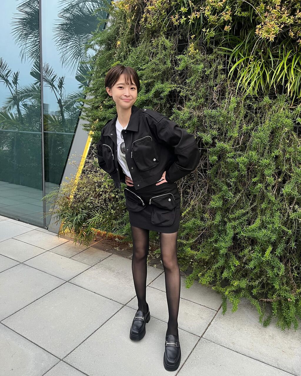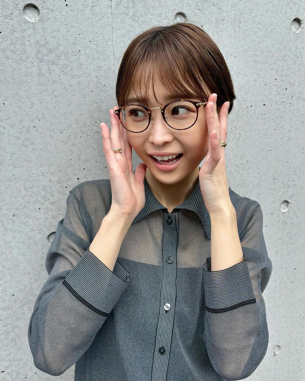 「最近の私服 メガネを新調しました @ohmyglassestokyo」とメガネ店のアカウントを添えて投稿。1枚目には胸元がシースルーになったシャツにメガネ姿、3枚目には黒いミニスカートに黒いストッキングを合わせ、極細スタイルが際立つコーデ。