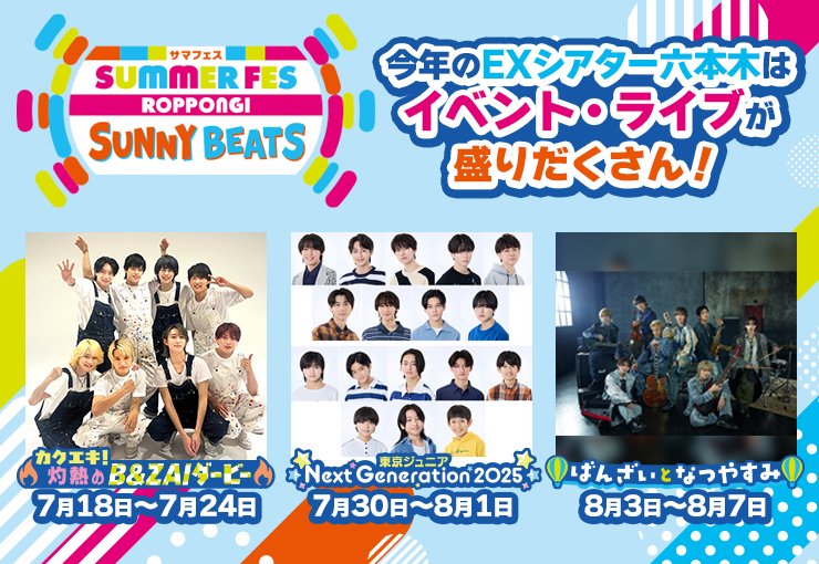 テレビ朝日・六本木ヒルズ SUMMER FES @exsummerstation 🎉今年も開催決定🎉 🌻━━━━━━━━━ テレビ朝日・六本木ヒルズ SUMMER FES ━━━━━━━━━🌻 #サマフェス2025 夏の恒例イベントがさらに進化⚡ 🎤コカ•コーラ SUMMER FES 音楽LIVE 六本木ヒルズアリーナの特設野外ステージで、 日替わりのアーティストライブを実施🕺 🎪EXシアター六本木 B&ZAIは、ジュニアの出演番組『カクエキ!』と コラボしたガ*対決イベント、 さらには単独イベントも開催✨ 東京ジュニアNext Generation 2025のライブも🪩 📺ドラえもんや人気番組の特別ブースも テレビ朝日本社1階では人気番組と メタバースが融合したブースが登場❗ ドラえもんのフォトスポットや、 スペシャルメニューもお楽しみいただけます🩵 🗓7月19日(土)~8月17日(日) 🔗公式サイト