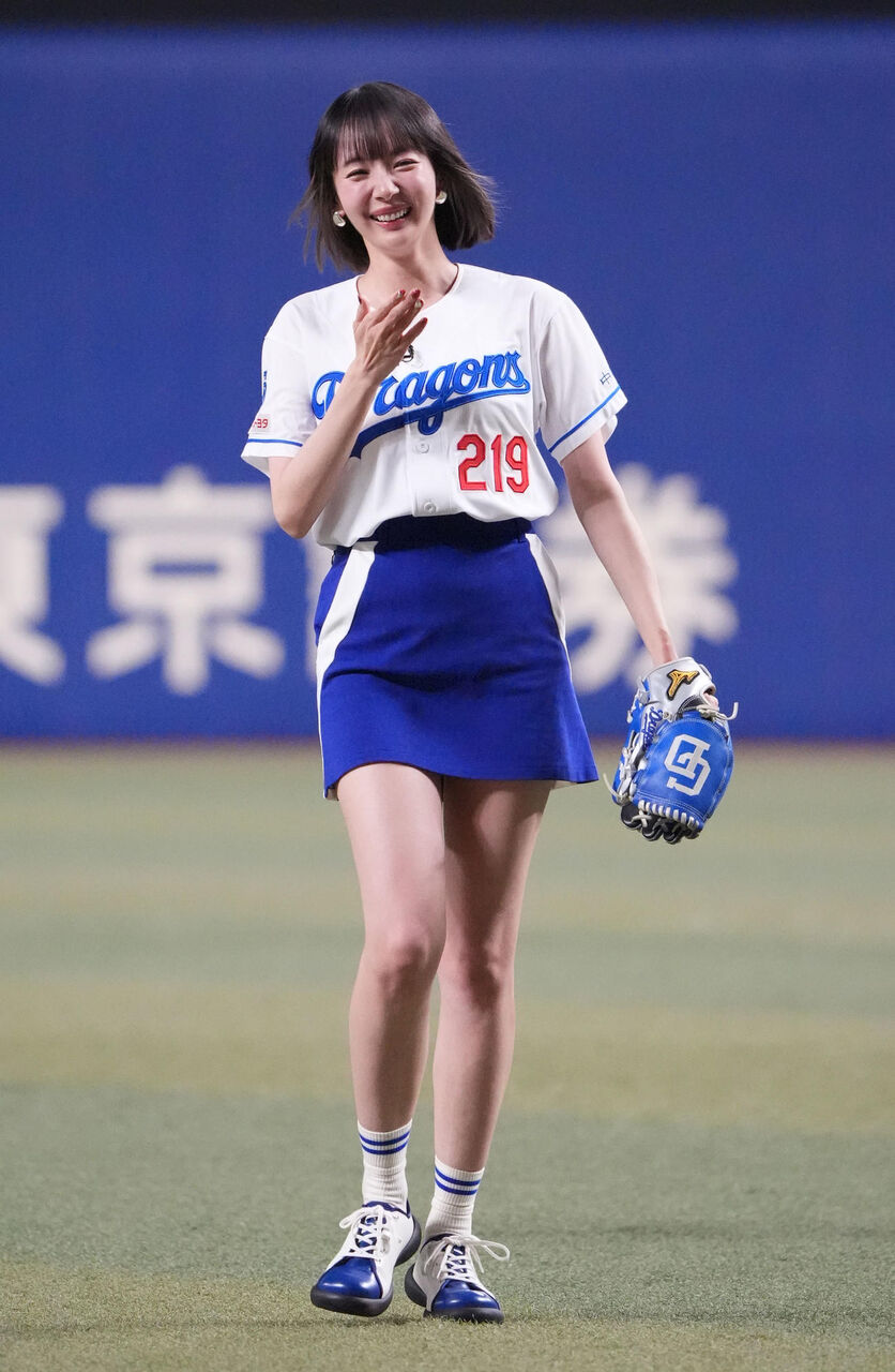 “役満ボディー”岡田紗佳が青のミニスカ姿で始球式「足を上げた瞬間にうぉ~となって」