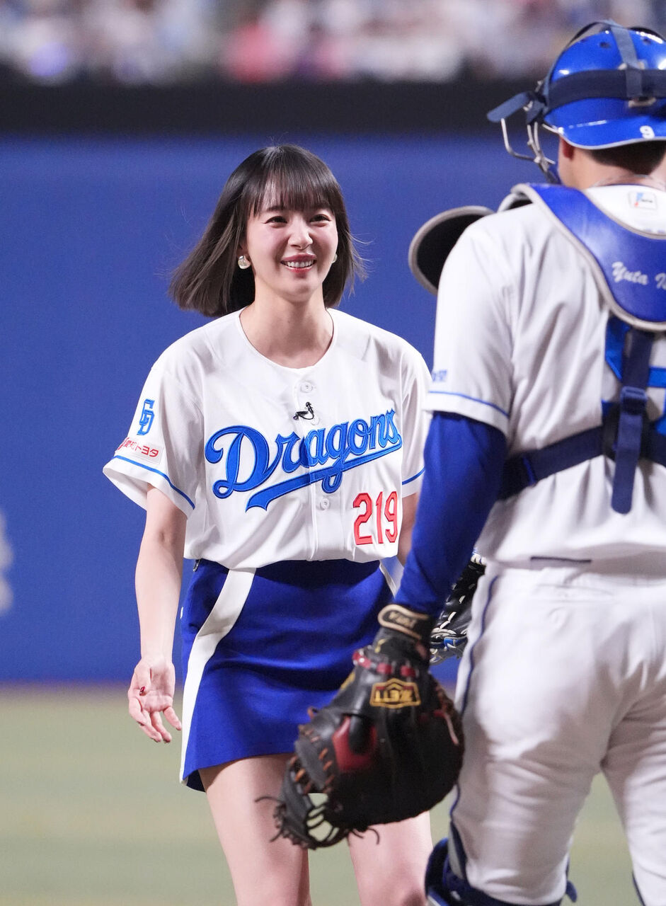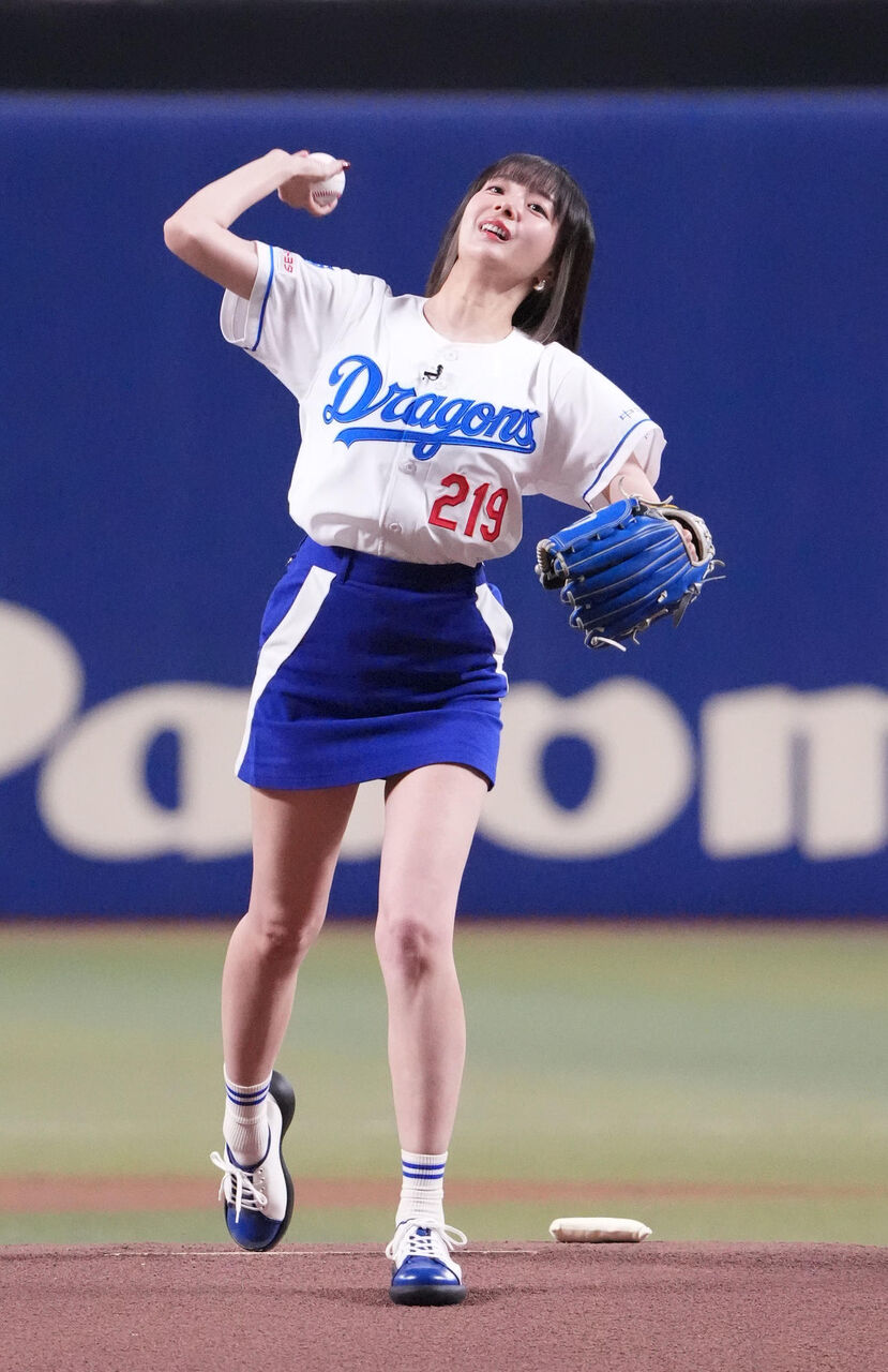 ドラゴンズの半袖レプリカユニホームにチームカラーに合わせたブルーのミニスカートのいでたちでマウンドに上がると、まずは深く一礼。何といっても注目を集めたのはその投球フォームだった。